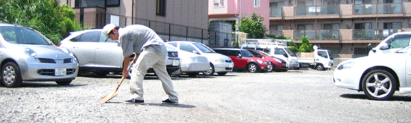 - 2週間に1回(月に2回)、必要な所を掃除致します。(駐車場内の除草、 放置物の撤去、吹きだまりに溜まった落ち葉やゴミの清掃、未舗装の駐車場 の砂利撒き。)